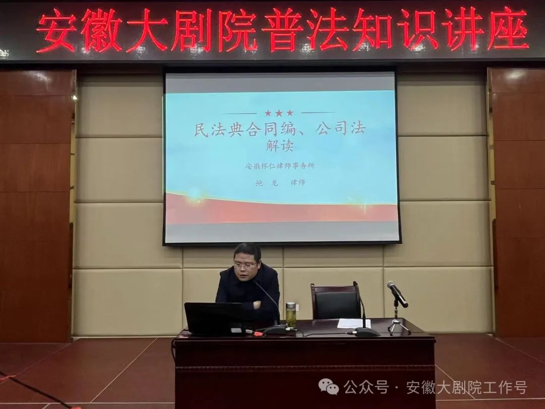 为进一步增强干部职工风险意识和法律意识,营造尊法学法用法守法的良好氛围。2月26日,安徽大剧院党总支邀请安徽怀仁律师事务所鲍龙律师开展了以解读《民法典》合同编、《公司法》为主题的普法主题党日活动。会议由党总支委员、副总经理胡霞主持,大剧院全体党员及干部职工参加活动。