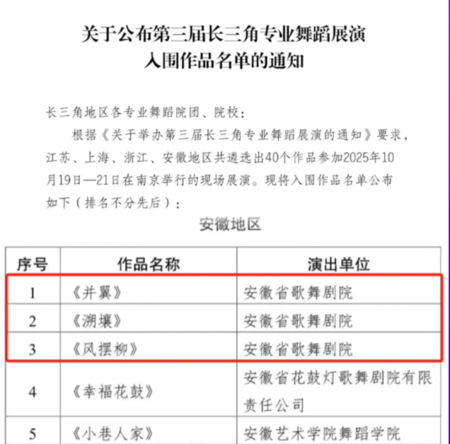 据悉,第三届长三角专业舞蹈展演是长三角地区最高规格的专业舞蹈赛事活动之一,竞争激烈。本次展演汇聚了沪苏浙皖四地舞蹈精英,吸引众多专业院团、院校踊跃参与。此次3部作品入围是安徽省歌舞剧院聚焦精品创作、深耕舞台艺术的重要成果。