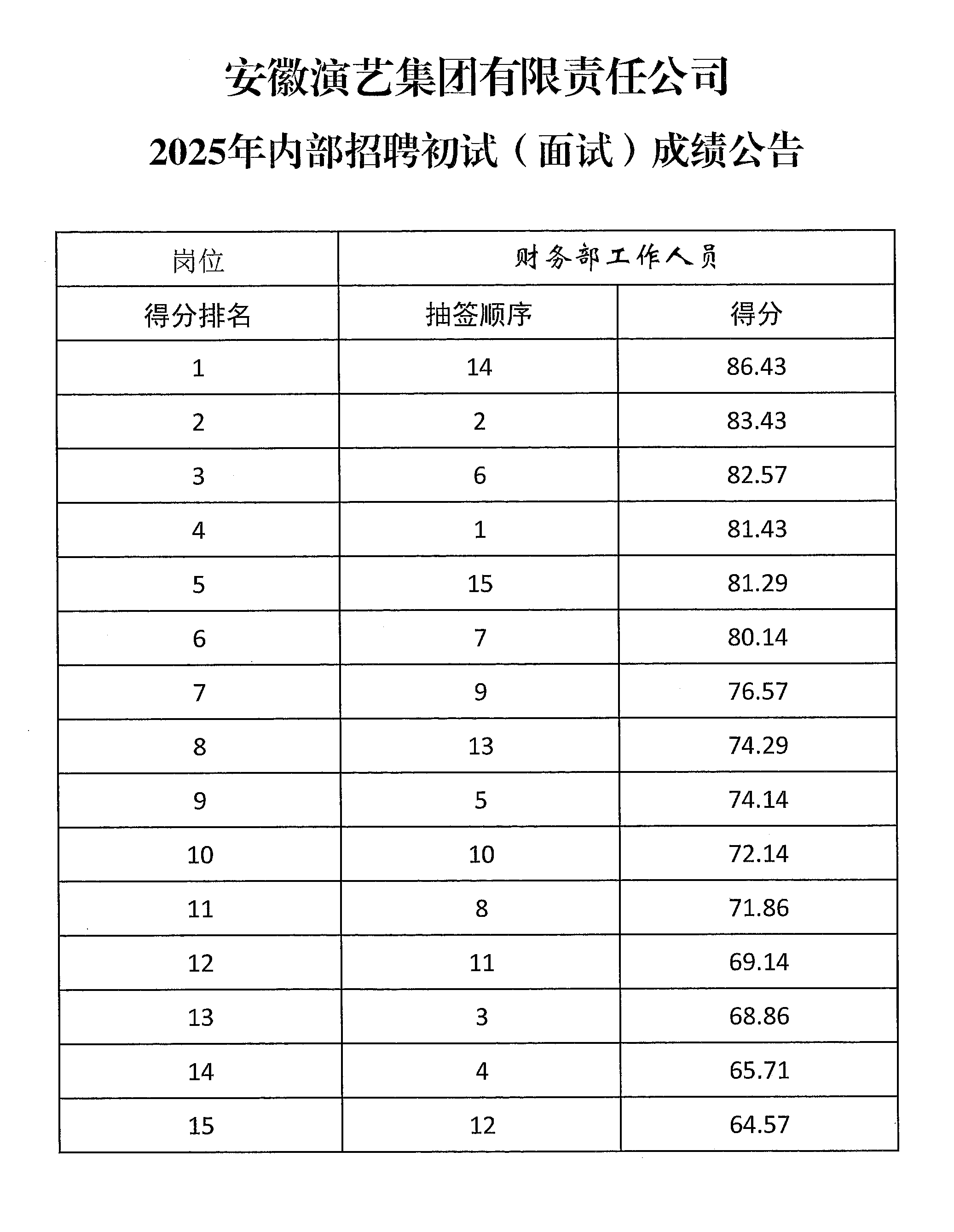 2025年内部招聘初试(面试)成绩公告
