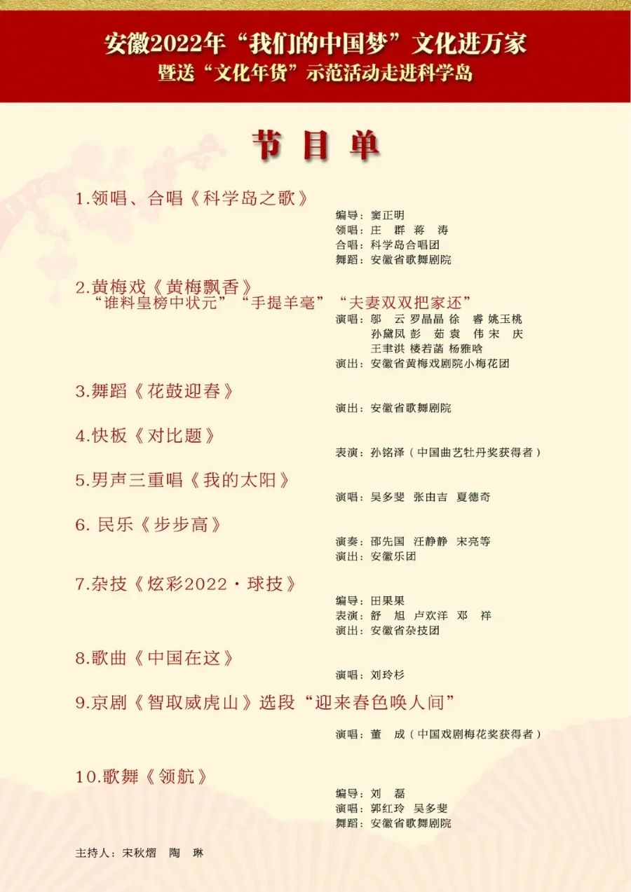 此次活动由省委宣传部、省文明办、省文化和旅游厅、省广电局、省文联主办,中国科学院合肥物质研究院、安徽演艺集团等承办。文艺名家小分队展风采、送祝福,省书协组织书法家书写春联、“福”字,省摄协为科技工作者拍摄全家福,省民协献上窗花剪纸和木板年画,志愿服务活动受到热烈欢迎。