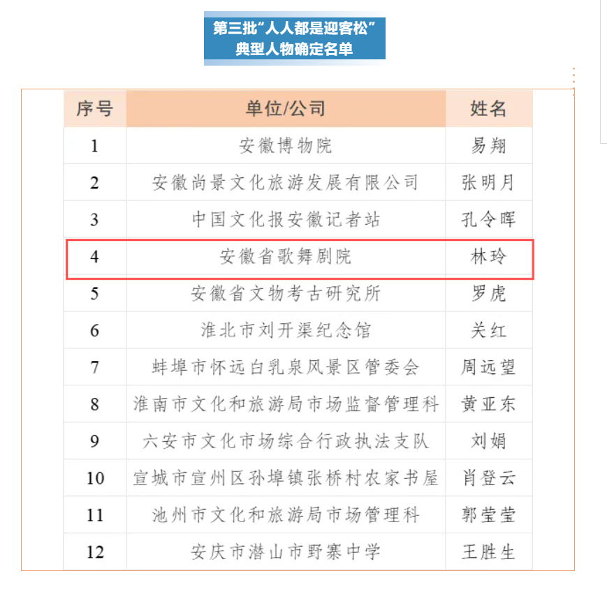 近日,省文化和旅游厅公布了第三批“人人都是迎客松”典型人物,安徽省歌舞剧院(省演出公司)党支部书记、院长(总经理)林玲成功入选。