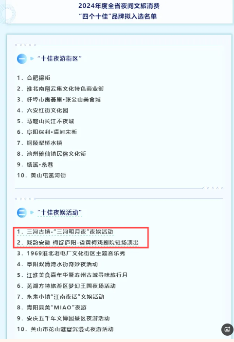 近日,安徽省文化和旅游厅发布了2024年度全省夜间文旅消费“四个十佳”品牌,集团两项活动成功入选“十佳夜娱活动”,分别是省歌舞剧院(省演出公司)策划创作的三河古镇——“三河明月夜”夜娱活动以及“戏韵安徽 梅绽庐阳”——省黄梅戏剧院驻场演出。